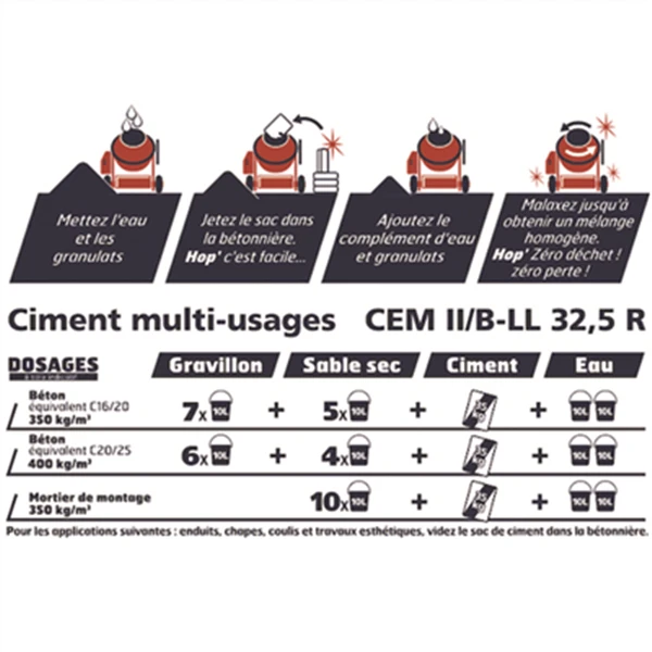 Ciment Hop’ est un ciment de type CEMII/B-LL 32,5R CP2.