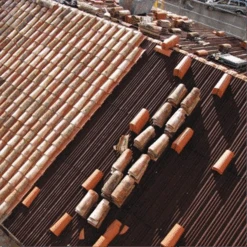 Demi-tuile à emboîtement grand moule faiblement galbée à relief en terre cuite.