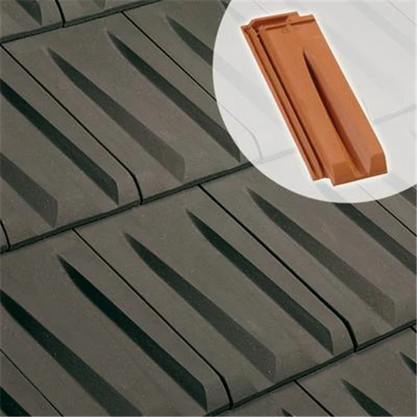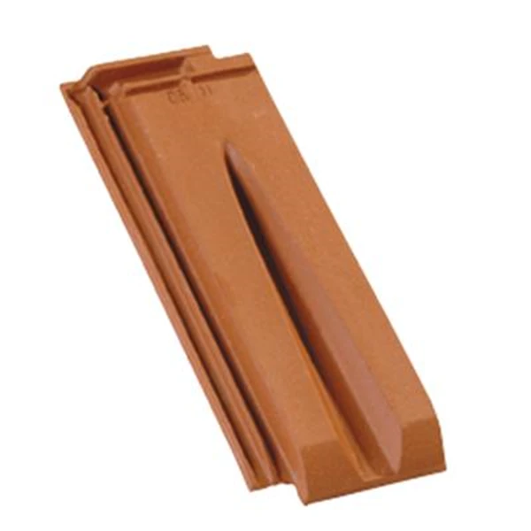 Demi-tuile à emboîtement grand moule faiblement galbée à relief en terre cuite.