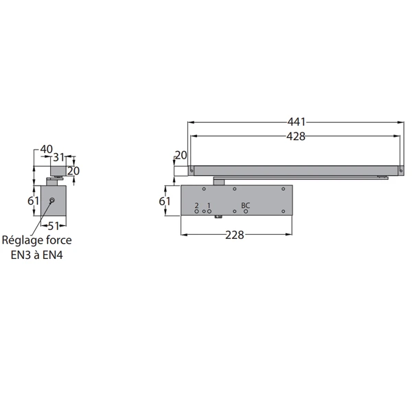 - Réglage de la vitesse de fermeture par la vis à double empreinte (plate et 6 pans).